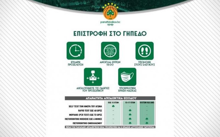 - Οι κάτοχοι κάρτας διαρκείας ή απλού εισιτηρίου οφείλουν να προσέρχονται στο γήπεδο με το πιστοποιητικό εμβολιασμού ή το πιστοποιητικό νόσησης κατά τους έξι τελευταίους μήνες, το οποίο θα επιδεικνύουν στους προελέγχους, μαζί με το έγγραφο ταυτοποίησης (ταυτότητα, διαβατήριο ή άδεια παραμονής).