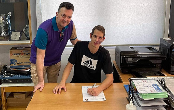 Στη φωτό υπογράφει το συμβόλαιο του, παρουσία του Γεν.Γραμματεα του Συλλόγου μας, Χάρη Γάσπαρη».