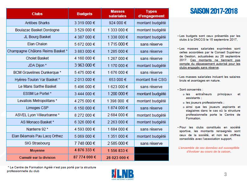 Με μια πρώτη ματιά στον παρακάτω πίνακα, στην πρώτη στήλη του οποίου περιλαμβάνεται το συνολικό μπάτζετ και στη δεύτερη η μισθοδοσία παικτών και προπονητών, προκύπτει ότι το μέσο μπάτζετ στην ProA της LNB αγγίζει τα 5 εκ. Ευρώ (4,8 εκ. για την ακρίβεια), ενώ μόνο για μισθούς παικτών και προπονητών μια μέση γαλλική ομάδα ξοδεύει 1,5 εκ. Ευρώ. Μόνο δύο είναι, μάλιστα, οι ομάδες οι οποίες θα ξοδέψουν φέτος για μισθούς λιγότερα από 1 εκ. Ευρώ (η Αντίμπ 924.οοο και η Τουλόν μόλις 653.000).