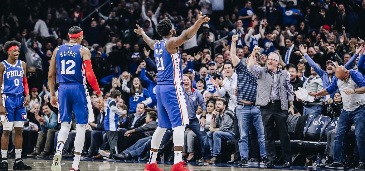 Ο Τζόελ Εμπίντ έβαλε… τρελό καλάθι στο «Wells Fargo Center», χωρίς καν να βλέπει την μπασκέτα, και το πανηγύρισε ανάλογα.