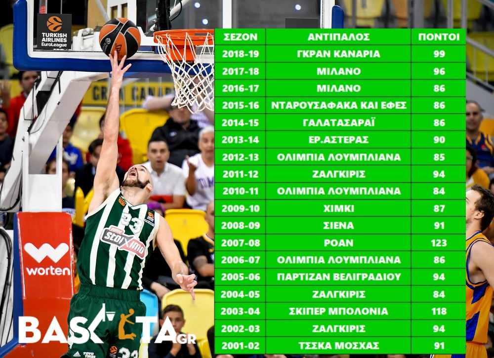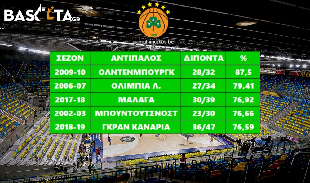 Οι 99 πόντοι που είχε χθες ο Παναθηναϊκός είναι η 4η μεγαλύτερη εκτός έδρας επίδοση στην ιστορία του στη διοργάνωση (από το 2001-02) μετά τους 123 επί της Ροάν τη σεζόν 2007-08, τους 118 επί της Σκίπερ Μπολόνια σε δύο παρατάσεις και τους 101 επί της Μπένετον Τρεβίζο στη σεζόν 2003-04.