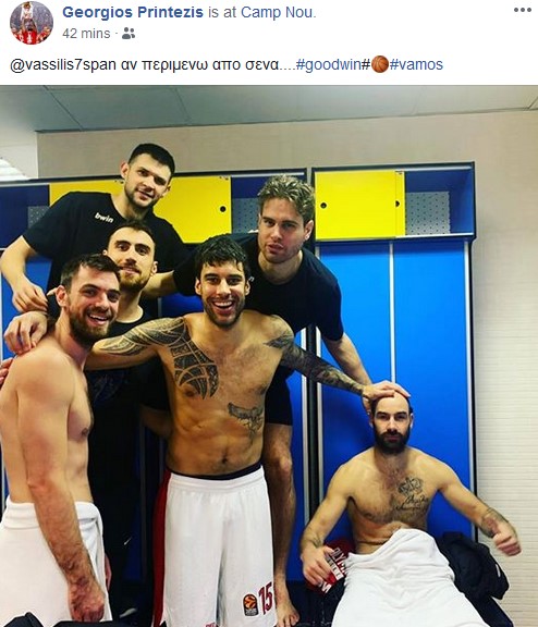 Τα χαμόγελα περισσεύανε στις τάξεις των "ερυθρόλευκων" και λογικό μετά τη νίκη του Ολυμπιακού από την Μπαρτσελόνα. Η φωτό του Γιώργου Πρίντεζη από τα αποδυτήρια με τον Βασίλη Σπανούλη, τον Κώστα Παπανικολάου, τον Νίκολα Μιλουτίνοφ, τον Γιώργο Μπόγρη και τον Βαγγέλη Μάντζαρη ήρθε να το... οπτικοποιήσει. Και μάλιστα πέταξε και την σπόντα του στον αρχηγό του Ολυμπιακού, ο οποίος προφανώς είχε υποσχεθεί να ανεβάσει την φωτό, αλλά αργούσε... Λίγο μετά πάντως, την ανέβασε κι αυτός στο instagram γράφοντας απλά "ΟΜΑΔΑ".