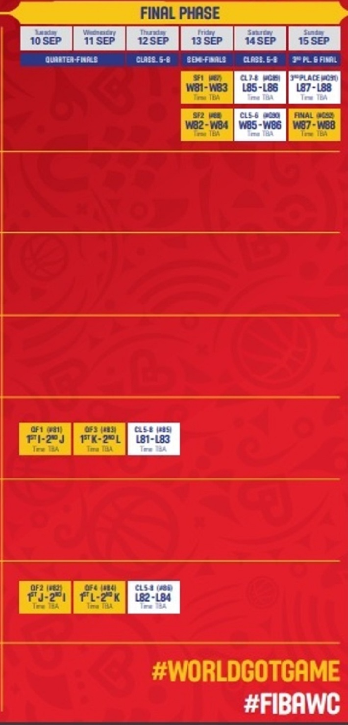 Ο ΣΤ’ Όμιλος, στον οποίο κληρώθηκε το αντιπροσωπευτικό συγκρότημα, διασταυρώνεται στη δεύτερη φάση, των «16», με τον Ε’ Όμιλο (ΗΠΑ, Τουρκία, Τσεχία, Ιαπωνία), με τους αγώνες να γίνονται στις 7 και τις 9 Σεπτεμβρίου. Τα προημιτελικά θα διεξαχθούν το διήμερο 10-11 Σεπτεμβρίου, τα ημιτελικά την Παρασκευή 13/09 και ο τελικός την Κυριακή 15/09. Η αυλαία της διοργάνωσης θα ανοίξει στις 31 Αυγούστου, με τα παιχνίδια των πρώτων τεσσάρων ομίλων. Θυμηθείτε, εδώ, τους ομίλους του Παγκοσμίου Κυπέλλου της Κίνας.