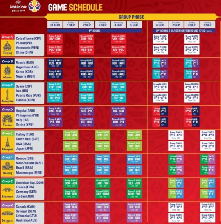 Η FIBA ανακοίνωσε το ακριβές πρόγραμμα των αγώνων του Παγκοσμίου Κυπέλλου 2019, με την Εθνική Ελλάδας Ανδρών να κάνει πρεμιέρα την Κυριακή 1η Σεπτεμβρίου κόντρα στο Μαυροβούνιο, ενώ εν συνεχεία θα παίξει την Τρίτη 03/09 με τη Βραζιλία και την Πέμπτη 05/09 με τη Νέα Ζηλανδία.