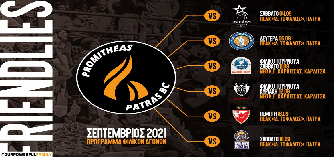 Το συγκρότημα του Luis Casimiro θα ξεκινήσει τα φιλικά προετοιμασίας το ερχόμενο Σάββατο (4/9) απέναντι στον Ιωνικό στην Πάτρα, σε έναν αγώνα προπονητικού χαρακτήρα που θα διεξαχθεί χωρίς την παρουσία θεατών, ενώ δύο μέρες αργότερα, οι Πατρινοί θα υποδεχτούν τον Ηρακλή σε κεκλεισμένων των θυρών αναμέτρηση. Στη συνέχεια, στις 11 και 12 Σεπτέμβρη οι «Προμηθείς» θα ταξιδέψουν στην Καρδίτσα για ένα φιλικό τουρνουά, όπου θα παρευρεθούν ακόμα ο ΠΑΟΚ, η Λάρισα και η τοπική ομάδα της Καρδίτσας. Την πρώτη αγωνιστική ημέρα, οι Αχαιοί θα παίξουν με τη Λάρισα, ενώ την δεύτερη ημέρα θα αντιμετωπίσουν τον ΠΑΟΚ. Τέλος, ο Προμηθέας θα δώσει δύο πολύ δυνατά φιλικά στην Πάτρα με παρουσία κόσμου, με το «Δ.Τόφαλος» να ανοίγει τις πύλες για το κοινό για πρώτη φορά μετά τον Φεβρουάριο του 2020. Το πρώτο ματς θα γίνει την Πέμπτη 16 Σεπτεμβρίου απέναντι στον πρωταθλητή Σερβίας, Ερυθρό Αστέρα σε ένα πολύ δυνατό παιχνίδι επιπέδου Euroleague, ενώ το Σάββατο (18/9) θα υποδεχτεί το Λαύριο, σε μια άτυπη…επανάληψη της συναρπαστικής ημιτελικής σειράς τη σεζόν 2020-21.