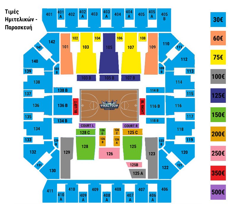 Για το 70% των συνολικών διαθέσιμων θέσεων διατίθενται προς το παρόν δύο πακέτα εισιτηρίων. Ένα που αφορά και τις δύο μέρες του φάιναλ φορ (4 αγώνες) και τιμάται προς 50 Ευρώ κι ένα που αφορά μόνο την ημέρα των ημιτελικών και τιμάται προς 30 Ευρώ. Για την ημέρα των τελικών, η διαθεσιμότητα και οι τιμές θα ανακοινωθούν αμέσως μετά τη λήξη των ημιτελικών.
