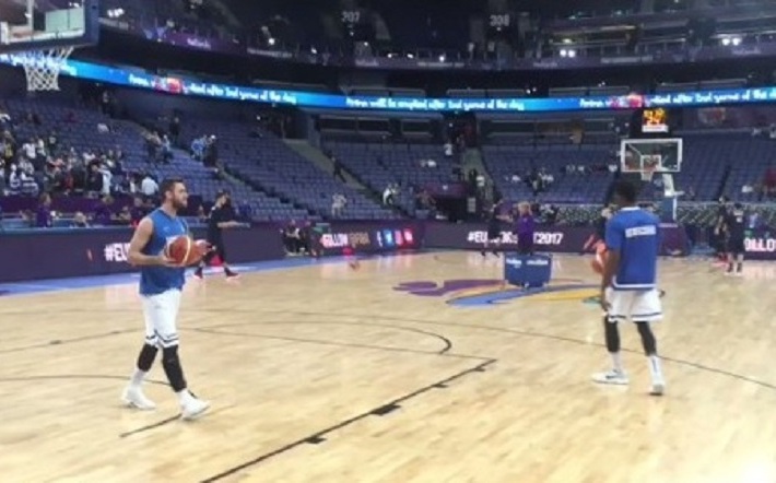 Ο Βαγγέλης Μάντζαρης και ο Θανάσης Αντετοκούνμπο ήταν οι πρώτοι παίκτες της Εθνικής Ελλάδας που βγήκαν για προθέρμανση στο Ελσίνκι, πριν από το ματς με τη Γαλλία.