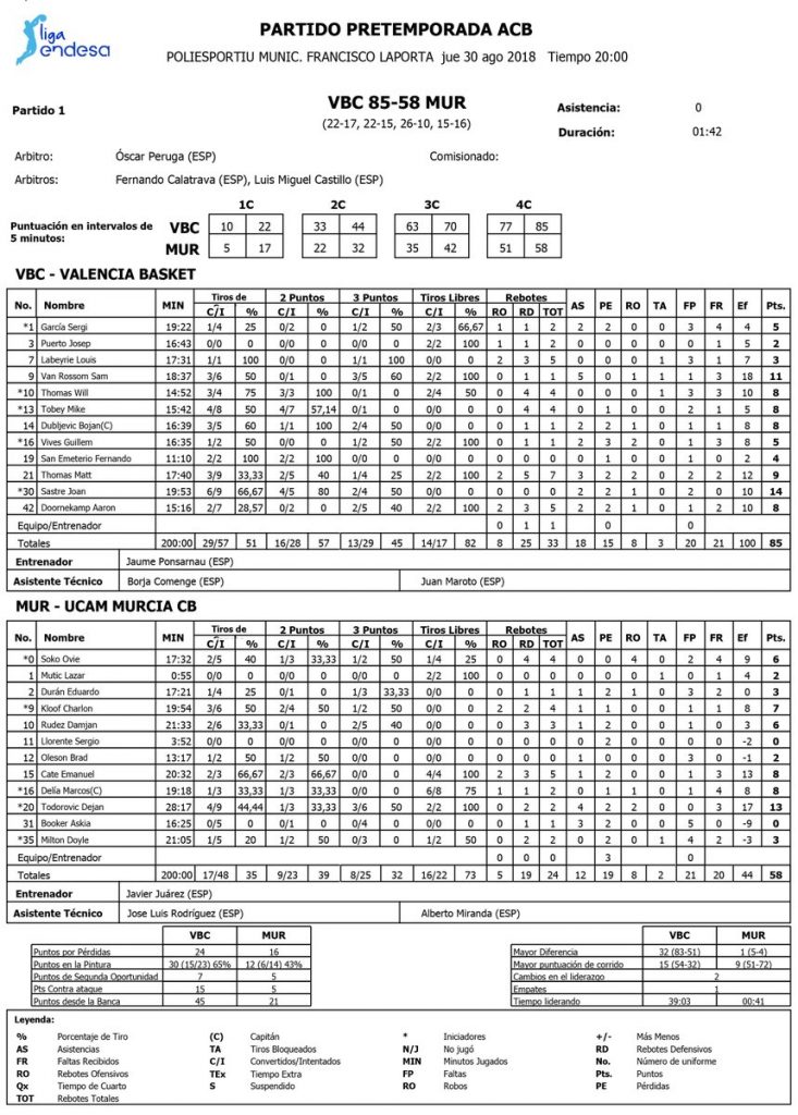 Κανένα περιθώριο δεν άφησε η Βαλένθια στην Μούρθια στο πρώτο φιλικό των δύο ομάδων. Οι "πορτοκαλί" επικράτησαν 85-58, έχοντας τον πρώτο λόγο από την αρχή ως το τέλος της αναμέτρησης.
