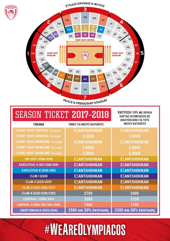 Βασική Ενημέρωση: Η διάθεση των καρτών διαρκείας των κατηγοριών VIP/ Court Seats καθώς και των οικογενειακών εισιτηρίων διαρκείας θα πραγματοποιείται είτε τηλεφωνικά στα τηλέφωνα που αναφέρονται πιο πάνω, είτε από τα γραφεία της Κ.Α.Ε. ΟΛΥΜΠΙΑΚΟΣ.