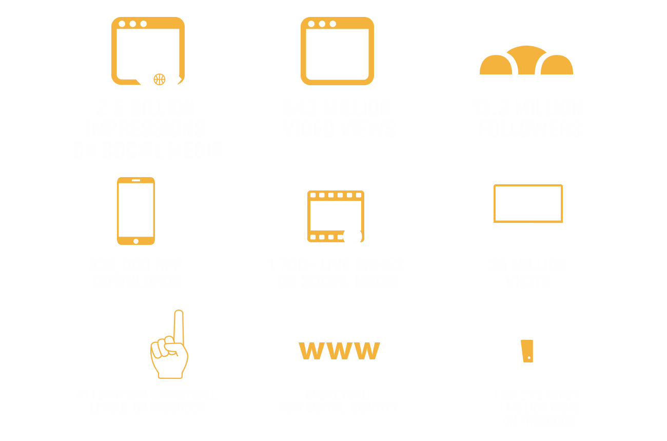 - 643εκ. ήταν οι θεάσεις που είχαν τα βίντεο που ανέβασε η FIBA στους λογαριασμούς της μέσα στο 2017. Ο συνολικός αριθμός για το 2017, ήταν τέσσερις φορές και πλέον, υψηλότερος από τον αντίστοιχο του 2016.