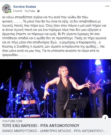 «Aν κάνω οποιοδήποτε σχόλιο και πω αυτά που νιώθω θα πάω φυλακή............Τα μόνα που θα πω είναι τα εξής: α).δεν αποβλήθηκα με τεχνικές ποινές που πήρα εγώ. Όλες ήταν στον πάγκο η μιά γιατί πήραν και οι άλλοι τεχνική ποινή και για ένα περίεργο λόγο που δεν μου εξήγησε ο άρχοντας έπρεπε να πάρουμε και εμείς. Β) Ρε γίγαντα έγραψες ότι σου επιτέθηκαν οπαδοί και η ομάδα δεν σε προστάτεψε. Ποιός σε πήρε αγκαλιά και σε πήγε μέσα στα αποδυτήρια; Εγώ , ο Δημήτρης ο Καραφαντής , ο Κώστας ο Σκιαθίτης τι είμαστε; Δεν είμαστε εκπρόσωποι της ομάδας;;;; Να ήταν μόνο αυτά να μου πεις. Για τα υπόλοιπα ακούστε τα λόγια από το τραγουδάκι..........».