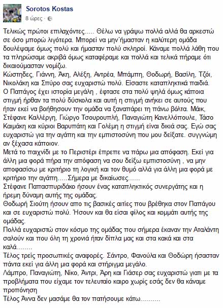 «Τελικώς πρώτοι επιλαχόντες..... Θέλω να γράψω πολλά αλλά θα αρκεστώ σε όσο μπορώ λιγότερα. Μπορεί να μην΄ήμασταν η καλύτερη ομάδα δουλέψαμε όμως πολύ και ήμασταν πολύ σκληροί. Κάναμε πολλά λάθη που τα πληρώσαμε ακριβά όμως καταφέραμε και πολλά και τελικά πήραμε ότι δικαιούμασταν νομίζω.