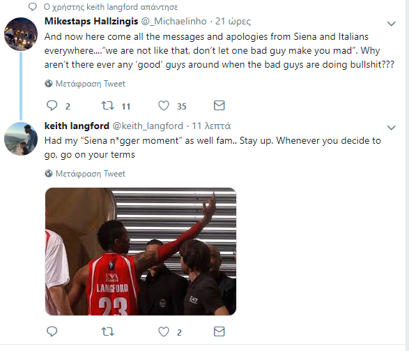 Η ανάρτησή του έφερε και την απάντηση του Κιθ Λάνγκφορντ, ο οποίος είχε ζήσει μια ανάλογη στιγμή, στο ίδιο γήπεδο, όταν έπαιζε στην Ιταλία για την Αρμάνι Μιλάνο. Ο γκαρντ του Παναθηναϊκού φρόντισε μάλιστα να ποστάρει και την... απάντησή του προς τον οπαδό που χρησιμοποίησε ρατσιστικά σχόλια σε βάρος του. Βέβαια η απορία του Χολ είναι μάλλον όλα τα λεφτά: "Τώρα δέχομαι απολογητικά σχόλια του τύπου δεν είμαστε όλοι έτσι και είμαστε καλοί, αλλά που είναι όλοι αυτοί οι καλοί, όταν άσχημα πράγματα συμβαίνουν;"