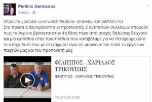 Όπως ήταν αναμενόμενο, οι τοποθετήσεις των δύο προπονητών έφεραν την αντίδραση από την πλευρά του ΑΟ Αγρινίου, με τον τον πρόεδρο της ομάδας, Περικλή Γερμανό, να παίρνει θέση μέσω λογαριασμού του στα Μέσα Κοινωνικής Δικτύωσης, γράφοντας πως: «Στα πρώτα 5 δευτερόλεπτα οι προπονητές 2 αντιπάλων συλλόγων απορούν πως το Αγρίνιο βρίσκεται στην 4η θέση.πέρα από ατυχές δηλώσεις δείχνουν και μία εμπάθεια στην προσπάθεια που καταβάλαμε για να πετύχουμε αυτό το στόχο.Αυτό που με στεναχωρεί είναι ότι μειώνουν πιο πολύ το έργο των παιχτών μας και του προπονητή μας»