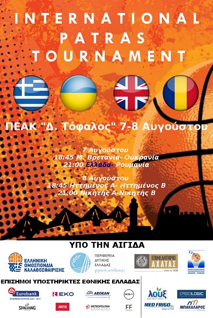 Η ανακοίνωση: «Την ευκαιρία να θαυμάσουν και να χειροκροτήσουν τους άσους της Εθνικής Ελλάδας από κοντά θα έχουν οι πατρινοί φίλαθλοι, καθώς η Εθνική Ανδρών θα πάρει μέρος σε τουρνουά που θα φιλοξενηθεί στην Πάτρα, και συγκεκριμένα στο «Δημ. Τόφαλος» το διάστημα 7-8 Αυγούστου, με τη συμμετοχή των Εθνικών ομάδων της Μεγάλης Βρετανίας, της Ουκρανίας και της Ρουμανίας. Το τουρνουά αυτό θα αποτελέσει τα αποκαλυπτήρια της Εθνικής του Κώστα Μίσσα, καθώς θα είναι οι πρώτοι φιλικοί αγώνες, που θα δώσει η Εθνική Ελλάδας μετά την ολοκλήρωση του βασικού σταδίου της προετοιμασίας της στο Καρπενήσι, και θα συμμετάσχουν όλοι οι παίκτες της προεπιλογής της Εθνικής ομάδας: Δημήτρης Αγραβάνης, Γιάννης Αντετοκούνμπο, Θανάσης Αντετοκούνμπο, Νικ Καλάθης, Γιαννούλης Λαρεντζάκης, Βαγγέλης Μάντζαρης, Κώστας Μήτογλου, Γιώργος Μπόγρης, Γιάννης Μπουρούσης, Γιώργος Παπαγιάννης, Κώστας Παπανικολάου, Ιωάννης Παπαπέτρου, Νίκος Παππάς, Γιώργος Πρίντεζης και Κώστας Σλούκας.
