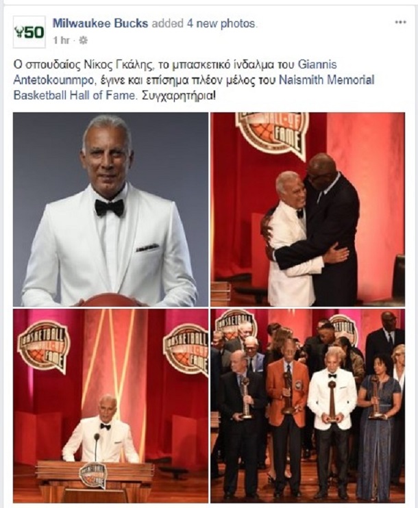 Στα ελληνικά συνεχάρησαν το Νίκο Γκάλη, για την είσοδό του στο Naismith Memorial Basketball Hall of Fame, οι Μιλγουόκι Μπακς.