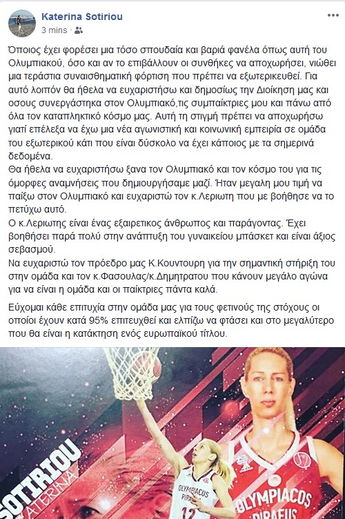 Λίγο νωρίτερα ο Ολυμπιακός ανακοίνωσε τη διακοπή της συνεργασίας με την Κατερίνα Σωτηρίου. Η αρχηγός της Εθνικής Γυναικών τοποθετήθηκε λίγο αργότερα διευκρινίζοντας πως δεν υοπάρχει κανένα πρόβλημα ή διαφωνία με τους "ερυθρόλευκους" ευχαριστώντας τους ανθρώπους με τους οποίους συνεργάστηκε: