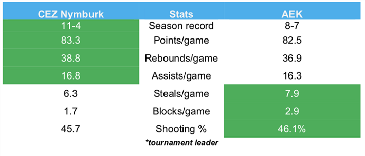 Νίμπουρκ κέρδισε τα δεκατρία από τα τελευταία δεκαπέντε εντός έδρας παιχνίδια της στη διοργάνωση και οι δύο ήττες της ήταν με εννέα ή λιγότερους πόντους. Επίσης, οι Τσέχοι έχουν αναδειχθεί νικητές στα τέσσερα από τα τελευταία πέντε ματς τους με ελληνικές ομάδες.