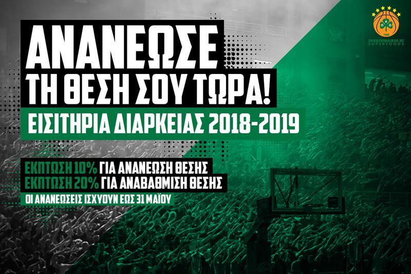 Η ΚΑΕ Παναθηναϊκός Superfoods ενημερώνει τους κατόχους διαρκείας της σεζόν 2017-18 πως από σήμερα, Πέμπτη 10/5/2018, μπορούν να ανανεώσουν ή να αναβαθμίσουν τη θέση τους στο ΟΑΚΑ και για την επόμενη αγωνιστική περίοδο (2018-19), επωφελούμενοι έκπτωσης από 10% μέχρι 20% σε όλες τις κατηγορίες.