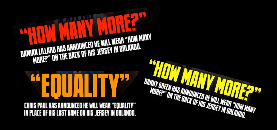 Το ΝΒΑ έχει προϊδεάσει πως οι ομάδες, οι παίκτες, το παρκέ, τα social media το #BlackLivesMatter θα κυριαρχεί. Οι παίκτες έχουν ήδη αρχίσει να επιλέγουν τα μηνύματα που θα στείλουν μέσα από τις φανέλες τους. Τρεις από αυτούς αποκάλυψαν τι επέλεξαν. Ο Κρις Πολ το απλό αλλά λίαν περιεκτικό "Equality" (Ισότητα) και οι Ντέιμιαν Λίλαρντ και Ντάνι Γκριν το "How Many More?" (Πόσοι ακόμη;).