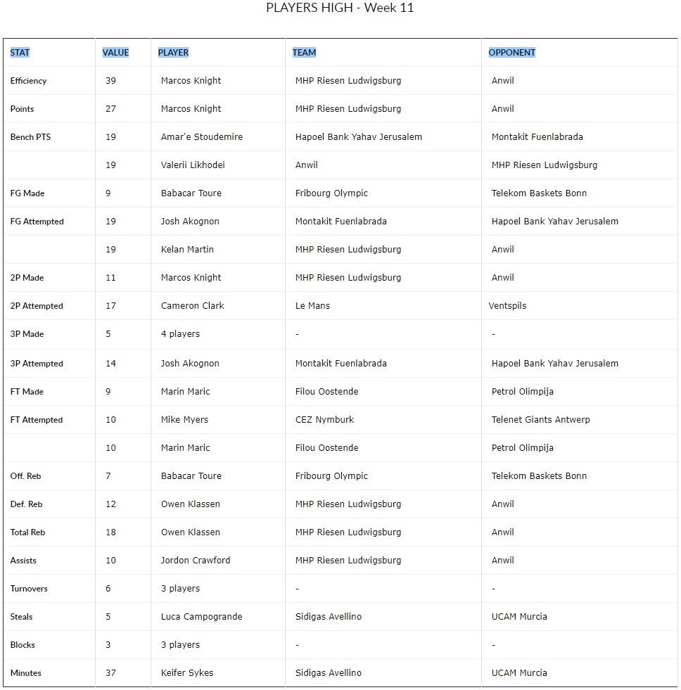 -Στον πίνακα που ακολουθεί δείτε τις κορυφαίες επιδόσεις των παικτών στις κυριότερες στατιστικές κατηγορίες του BCL, στο πλαίσιο της 11ης αγωνιστικής…