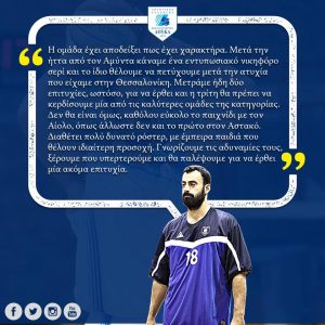 Ο 33χρονος σέντερ με δηλώσεις του στην επίσημη σελίδα του Δούκα στο Facebook δήλωσε πως “η ομάδα έχει αποδείξει πως έχει χαρακτήρα. Μετά την ήττα από τον Αμύντα κάναμε ένα εντυπωσιακό νικηφόρο σερί και το ίδιο θέλουμε να πετύχουμε μετά την ατυχία που είχαμε στην Θεσσαλονίκη. Μετράμε ήδη δύο επιτυχίες, ωστόσο, για να έρθει και η τρίτη θα πρέπει να κερδίσουμε μία από τις καλύτερες ομάδες της κατηγορίας. Δεν θα είναι όμως, καθόλου εύκολο το παιχνίδι με τον Αίολο, όπως άλλωστε δεν και το πρώτο στον Αστακό. Διαθέτει πολύ δυνατό ρόστερ, με έμπειρα παιδιά που θέλουν ιδιαίτερη προσοχή. Γνωρίζουμε τις αδυναμίες τους, ξέρουμε που υπερτερούμε και θα παλέψουμε για να έρθει μία ακόμα επιτυχία.