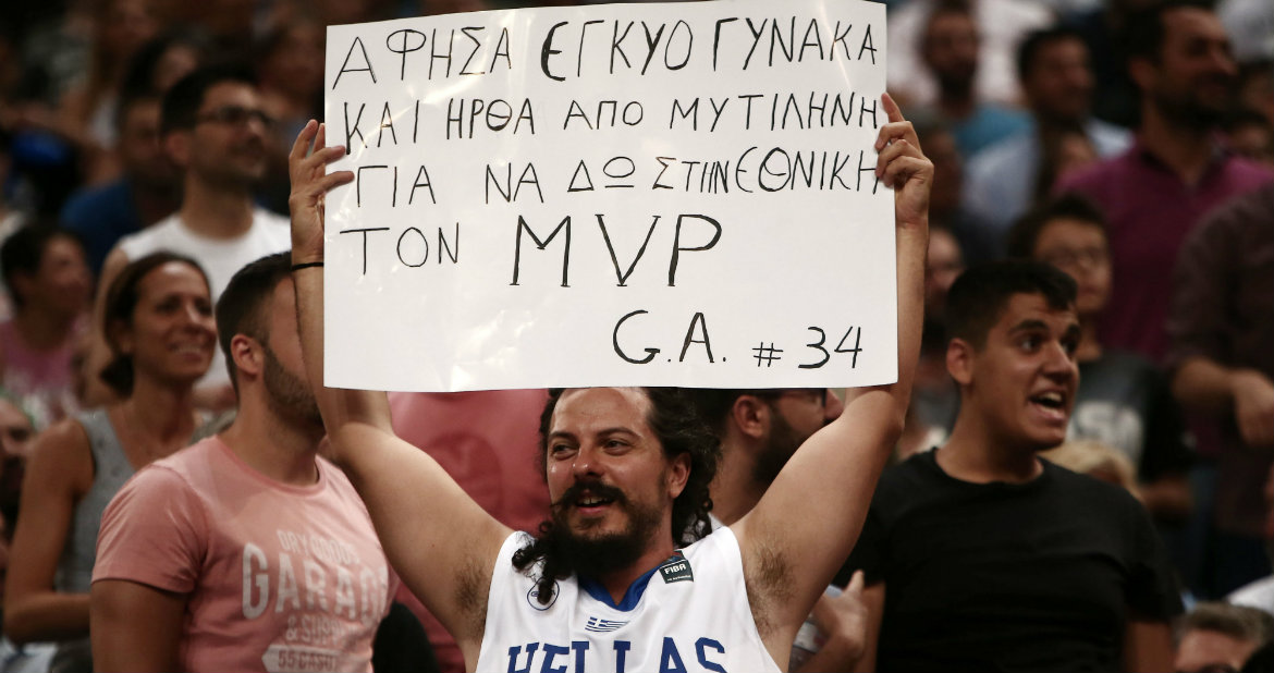 Ένα απίστευτο στιγμιότυπο πρόσφερε ένας φίλαθλος της Εθνικής μας ομάδας, με τον... θεούλη της εξέδρας να ανεβάζει πανό, ότι άφησε τη γυναίκα του έγκυο, αλλά αμέσως μετά πήγε να δει την Επίσημη Αγαπημένη για χάρη του Γιάννη Αντετοκούνμπο, κερδίζοντας τις εντυπώσεις.