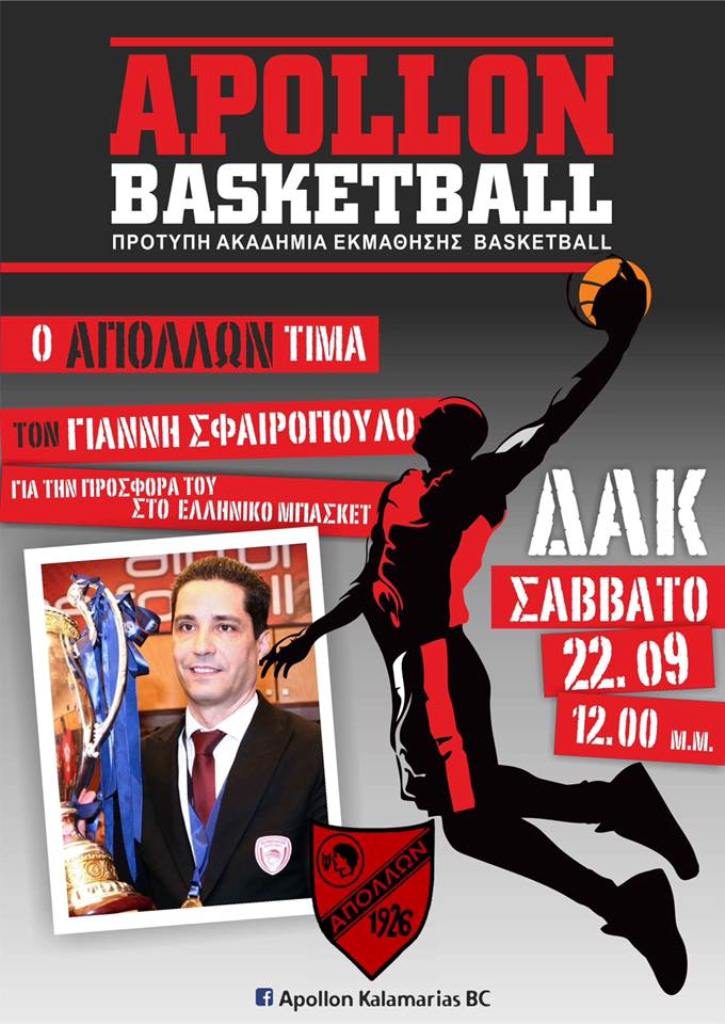Η ανακοίνωση: «Αγαπητοί μας φίλοι. Με μεγάλη χαρά και τιμή ύστερα από πολλά χρόνια πήραμε την απόφαση να τιμήσουμε ένα δικό μας άνθρωπο. Ο Γιάννης Σφαιρόπουλος, γέννημα θρέμμα του Απόλλωνα αφού ξεκίνησε τα πρώτα του μπασκετικά βήματα στην ομάδα μας, έφτασε σε σημείο να κοουτσάρει μεγαθήρια του Ευρωπαϊκού Μπάσκετ. Το Σάββατο 22/9/2018 και ώρα 12:00 μας δίνεται η ευκαιρία να τον ακούσουμε και να τον συναντήσουμε από κοντά, δίνοντάς μας πολύτιμες συμβουλές.