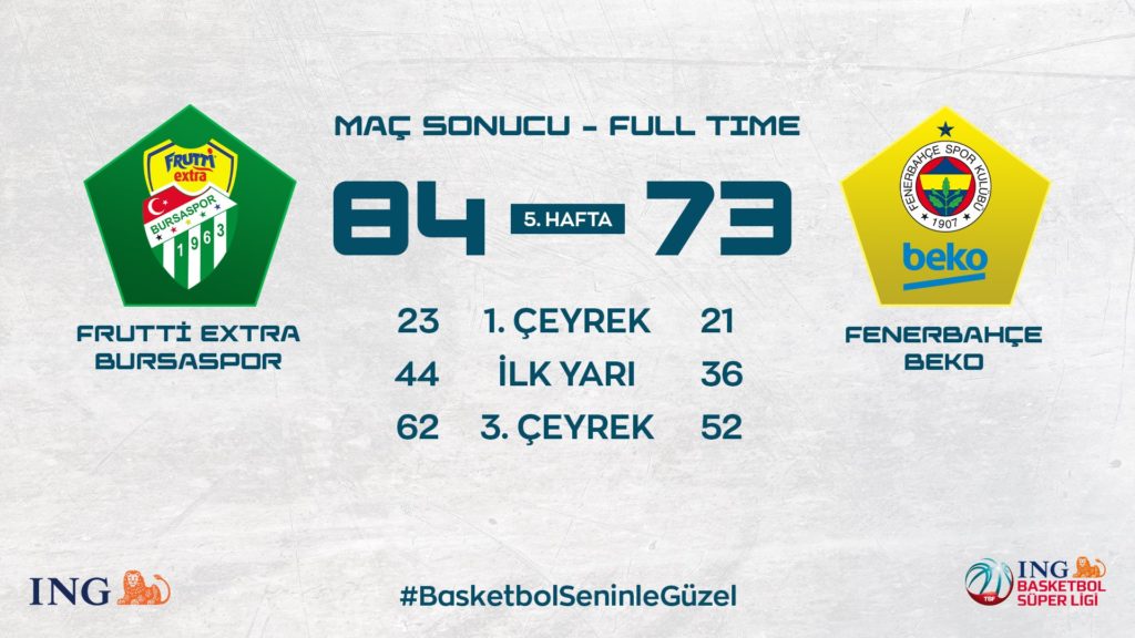 Η Φενερμπαχτσέ γύρισε από την υπερπροσπάθεια της Μαδρίτης στην Ευρωλίγκα που έφερε ήττα στο νήμα και φαίνεται ότι δεν κατάφερε να το ξεπεράσει. Πήγε σήμερα στην Προύσα να αντιμετωπίσει τη Μπούρσασπορ για το πρωτάθλημα Τουρκία και εκεί γνώρισε την πρώτη της ήττα, μετά από τέσσερις νίκες στην εκκίνηση, με σκορ 84-73.
