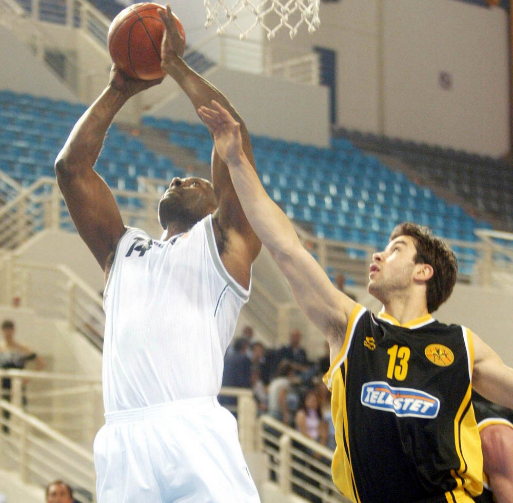 Ο Βασίλης Σπανούλης φορώντας το Νο13 σε προσπάθεια για ριμπάουντ απέναντι στον Πέρι Κάρτερ του ΠΑΟΚ