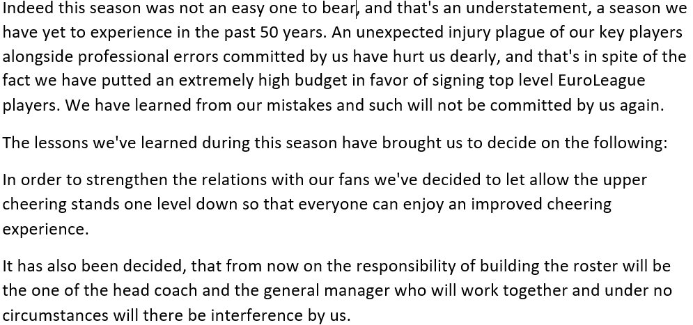 Κάνει λόγο για τραυματισμούς και ατυχίες, αλλά κυρίως για λάθη που έγιναν "παρά το υψηλό μπάτζετ και τις μεταγραφές αστέρων πρώτου μεγέθους". Και καταλήγει: "Μάθαμε από αυτά τα λάθη, γι' αυτό από εδώ και πέρα δεν θα υπάρχει παρέμβαση από εμάς. Το χτίσιμο του ρόστερ θα είναι δουλειά του προπονητή και τους general manager".