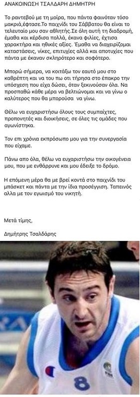 Θέλω να ευχαριστήσω όλους τους συμπαίχτες, προπονητές και διοικήσεις, σε όλες τις ομάδες που αγωνίστηκα. Τον επί χρόνια εκπρόσωπό μου για την συνεργασία που είχαμε. Πάνω από όλα, θέλω να ευχαριστήσω την οικογένειά μου, που με ενθάρρυνε και μου έδειξε το δρόμο. Η επόμενη μέρα θα με βρει κοντά στο παιχνίδι του μπάσκετ και πάντα με την ίδια προσέγγιση. Ταπεινός αλλά με τον εγωισμό του νικητή.  Μετά τιμής, Δημήτρης Τσαλδάρης».