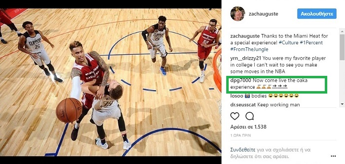 O 24χρονος φόργουορντ/σέντερ αγωνίστηκε με τη φανέλα των Μαϊάμι Χιτ, τους οποίους ευχαρίστησε μέσω του προσωπικού λογαριασμού του σε γνωστή ιστοσελίδα κοινωνικής δικτύωσης. «Ευχαριστώ πολύ τους Μαϊάμι Χιτ για τη φοβερή εμπειρία....», έγραψε ο Ζακ Όγκαστ στο Instagram, με το Δημήτρη Γιαννακόπουλο να… δράττει την ευκαιρία, σχολιάζοντας: «Τώρα, έλα να ζήσεις την εμπειρία του ΟΑΚΑ!».