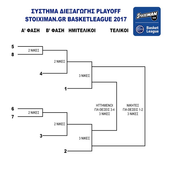 «Στην πρώτη φάση των πλέι οφ (ενδεικτικές ημερομηνίες 19/4-26/4) θα μετέχουν οι ομάδες που τερμάτισαν στις θέσεις 5-8 της βαθμολογίας της κανονικής περιόδου. Από αγώνες που θα κριθούν στις δύο νίκες θα αναδειχθούν δύο οι ομάδες οι οποίες θα αντιμετωπίσουν στην επόμενη φάση (29/4-7/5) τα σωματεία που τερμάτισαν στις θέσεις 3-4 της κανονικής περιόδου.