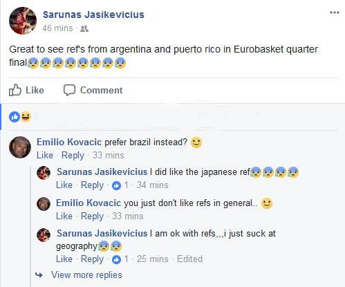 Ο Σαρούνας Γιασικεβίτσιους σχολίασε με τον δικό του τρόπο την επιλογή των διαιτητών. "Τέλειο να βλέπεις διαιτητές από Αργεντινή και Πουέρτο Ρίκο σε προημιτελικό του Ευρωμπάσκετ" έγραψε χαρακτηριστικά. Ο Εμίλιο Κόβασιτς τον ρώτησε αν θα προτιμούσε κάποιον από την Βραζιλία για να απαντήσει ο "Σάρας" πως του άρεσε ο Ιαπωνέζος ρέφερι ενώ παραδέχθηκε πως δεν πάει καλά στην γεωγραφία...