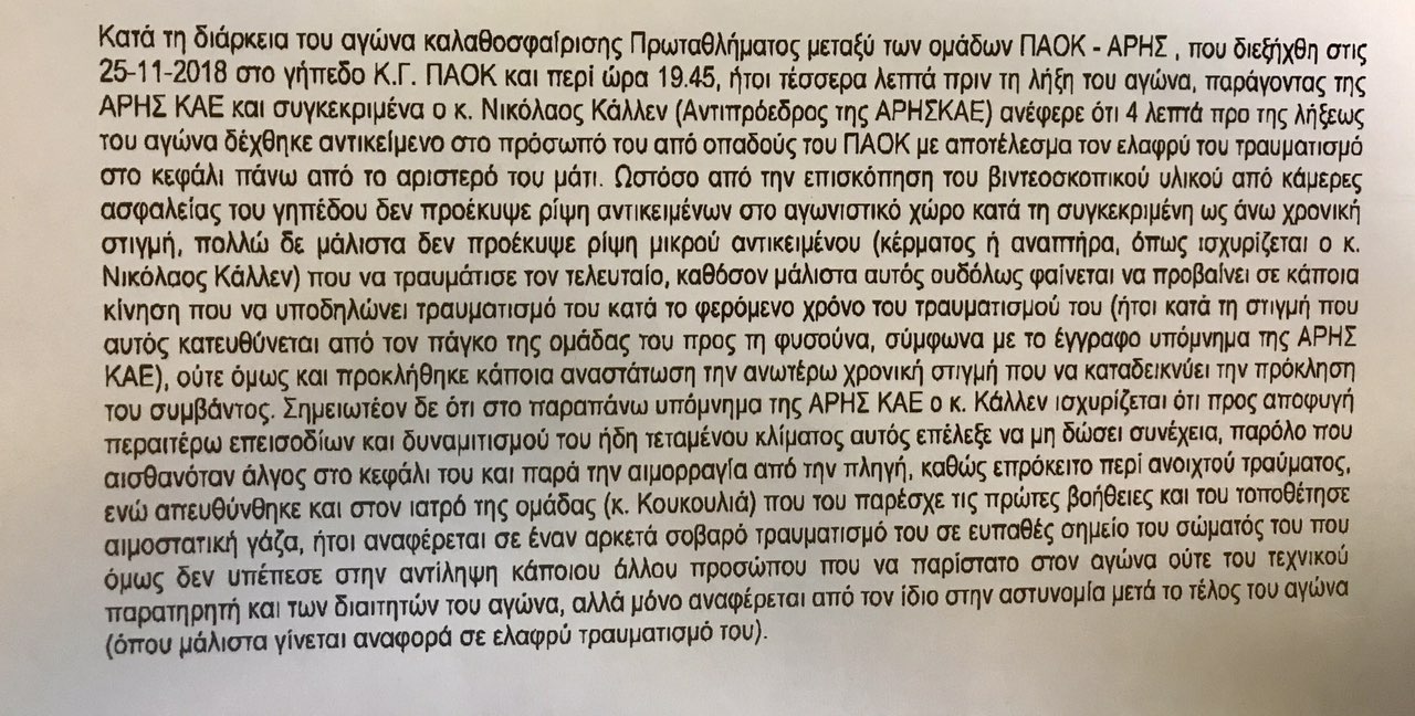Σημειωτέον δε ότι στο παραπάνω υπόμνημα της ΑΡΗΣ ΚΑΕ ο κ. Κάλλεν ισχυρίζεται ότι προς αποφυγή περαιτέρω επεισοδίων και δυναμιτισμού του ήδη τεταμένου κλίματος, αυτός επέλεξε να μη δώσει συνέχεια, παρόλο που αισθανόταν άλγος στο κεφάλι του και παρά την αιμορραγία από την πληγή, καθώς επρόκειτο περί ανοιχτού τραύματος, ενώ απευθύνθηκε και στον γιατρό της ομάδας (κ. Κουκουλιά), που του παρέσχε τις πρώτες βοήθειες και του τοποθέτησε αιμοστατική γάζα, ήτοι αναφέρεται σε έναν αρκετά σοβαρό τραυματισμό του σε ευπαθές σημείο του σώματος που όμως δεν υπέπεσε στην αντίληψη κάποιου άλλου προσώπου που να παρίστατο στον αγώνα ούτε του τεχνικού παρατηρητή και των διαιτητών του αγώνα, αλλά μόνο αναφέρεται από τον ίδιο στην αστυνομία μετά το τέλος του αγώνα (όπου μάλιστα γίνεται αναφορά σε ελαφρύ τραυματισμό του)”.