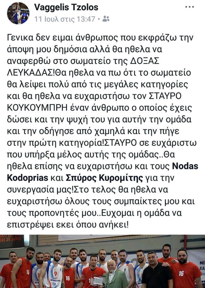 «Γενικα δεν ειμαι άνθρωπος που εκφράζω την άποψη μου δημόσια αλλά θα ηθελα να αναφερθώ στο σωματείο της ΔΟΞΑΣ ΛΕΥΚΑΔΑΣ!Θα ηθελα να πω ότι το σωματείο θα λείψει πολύ από τις μεγάλες κατηγορίες και θα ηθελα να ευχαριστήσω τον ΣΤΑΥΡΟ ΚΟΥΚΟΥΜΠΡΗ έναν άνθρωπο ο οποίος έχεις δώσει και την ψυχή του για αυτήν την ομάδα και την οδήγησε από χαμηλά και την πήγε στην πρώτη κατηγορία!ΣΤΑΥΡΟ σε ευχάριστω που υπήρξα μέλος αυτής της ομάδας..Θα ηθελα επίσης να ευχαριστήσω και τους Nodas Kodoprias και Σπύρος Κυρομίτης για την συνεργασία μας!Στο τελος θα ηθελα να ευχαριστήσω όλους τους συμπαίκτες μου και τους προπονητές μου..Ευχομαι η ομάδα να επιστρέψει εκει όπου ανήκει!»