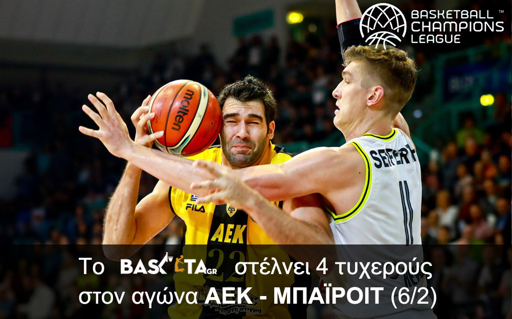 Η πρώτη φάση του Basketball Champions League ολοκληρώνεται και για την ΑΕΚ υπάρχει… τελικός πρόκρισης την τελευταία αγωνιστική. Η εντός έδρας αναμέτρηση με την Μπαϊρόιτ (06/02, 19.30) θα κρίνει τη συνέχειά της στη διοργάνωση και το Basketa.Gr σε συνεργασία με το Champions League στέλνει 4 τυχερούς στο ΟΑΚΑ για να συμπαρασταθούν στην προσπάθεια.