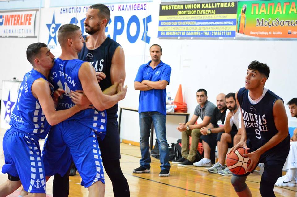 Μια εντελώς διαφορετική ομάδα, αλλά με την ίδια φιλοσοφία παρουσίασε ο Τρίτωνας του Μιχάλη Μιχελάκου, ο οποίος επικράτησε του αξιόμαχου, και ιδιαίτερα γεμάτου Δούκα με 68-66. Οι νικητές δεν είχαν στη διάθεση τους τον Κούτουλα, που αναμένεται να επιστρέψει στη δράση με το 2019, ενώ δεν αγωνίστηκε και ο Νικολακόπουλος. Εκτός προληπτικά ήταν για τον Δούκα ο Μήτσιαλος. Ο Τρίτωνας ξεκίνησε με πεντάδα τους Καλατζή, Βερτούδο, Ψαρόπουλο, Τσούτσο και Κουκουνιά, ενώ η ομάδα των Βορείων προαστίων έριξε στο παρκέ τους Ευστρατίου, Μποχωρίδη, Δενδρινό, Τσιτσιγιάννη και Βουγιούκα. Το παιχνίδι ξεκίνησε με τις δυο ομάδες να παρουσιάζονται ιδιαίτερα σφιγμένες, και το πρώτο καλάθι να έρχεται στο 6'41'' από τον Κουκουνιά για τον Τρίτωνα. Το πρώτο δεκάλεπτο ολοκληρώθηκε με 11-9, για να πάρει σταδιακά τα ηνία ο Δούκας στο δεύτερο δεκάλεπτο, και με 15 πόντους από τους Μποχωρίδη και Ευστρατίου να φτάσει στο ημίχρονο έχοντας το προβάδισμα με 31-29. Το τρίτο δεκάλεπτο άνηκε ολοκληρωτικά στην ομάδα του Μιχάλη Μιχελάκου, η οποία μπορεί να μην είχε πετύχει ούτε ένα τρίποντο στο πρώτο ημίχρονο, αλλά πέτυχε πέντε μαζεμένα φτάνοντας την διαφορά και στο +20 (56-36) με κάρφωμα του Κουκουνιά στο 29'. Το δεκάλεπτο ολοκληρώθηκε με 56-39, σημείο που ο Νάσος Χούμπαυλης πέρασε ως βασικό πλέι μέικερ τον Ευστρατίου, και τους Λάκκα και Μποχωρίδη δίπλα του. Ο Δούκας με πίεση σε όλο το γήπεδο, και με τον Λάκκα να ανεβάζει την απόδοση του (8 πόντους στο δεκάλπετο), έτρεξε ένα επιμέρους σερί 19-3, πλησιάζοντας στο στο -1 (59-58) στο 3'32'', μετατρέποντας το παιχνίδι σε ντέρμπι. Σε εκείνο το σημείο, με το μόλις δεύτερο δίποντο του ο Ντιμπ έγραψε το 65-60 στο 1'32'', με τον Ξύδη να εμφανίζεται θέλοντας να γίνει «ήρωας». Με δύσκολο τρίποντο μείωσε σε 65-63 στα 48'' (65-63), με τον Τσούτσο να απαντάει στα 40'' (68-63), και τον πρώην παίκτη του ΕΦΑΟΖ να ξανά ευστοχεί στα 22'' (68-66). Στη συνέχεια καμία ομάδα δεν μπόρεσε να σκοράρει, με τον Καλατζή να σταματάει την τελευταία πάσα του Αποστολίδη.