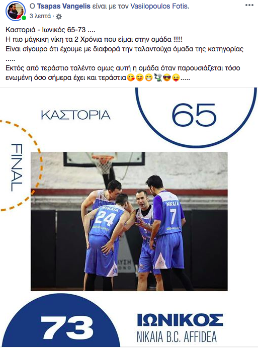 Ο Ιωνικός έκανε... παράσταση ανόδου στην Καστοριά και ο Βαγγέλης Τσάπας, σε ένα λακωνικό αυτή την φορά, πλην όμως ουσιώδες μήνυμά του μέσω Facebook, δεν έκρυψε την χαρά του για την πιο «μάγκικη», όπως την χαρακτήρισε, νίκη όσο καιρό βρίσκεται στην Νίκαια, εξαίροντας άπαντες για την ενότητα που έδειξαν.