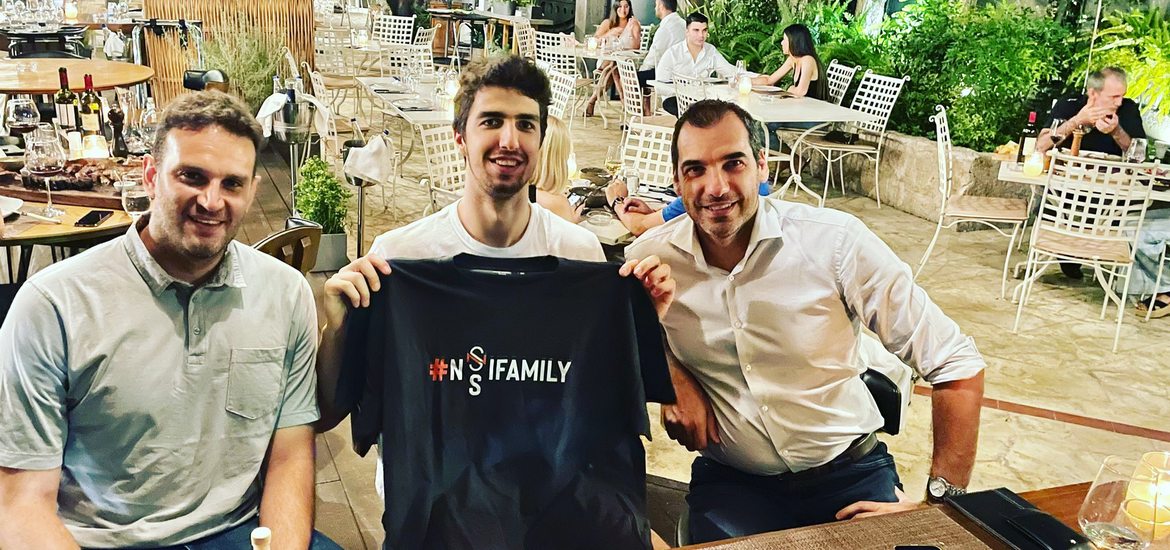 Ο διεθνής φόργουορντ-σέντερ μετά την οριστική συμφωνία του με τους «πράσινους» το γιόρτασε με τους εκπροσώπους του, τον Νίκο Σπανό και τον Χριστόφορο Χούμα. Το χαμόγελο του φανέρωνε την ικανοποίηση του.