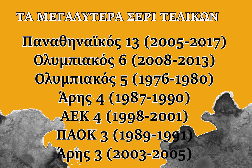 Το δικό του σερί τριών συνεχόμενων τελικών «έχτισε» ο ΠΑΟΚ από το 1989 ως το 1991 γνωρίζοντας ισάριθμες ήττες ενώ τέσσερις σερί με ισάριθμες μάλιστα κατακτήσεις τίτλου μέτρησε ο Άρης από το 1987 μέχρι το 1990 ενώ ήταν παρών και στους τελικούς του 1984 και το 1985, κατακτώντας την κούπα στον δεύτερο.