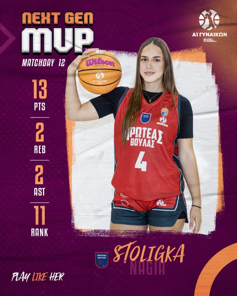 Η Νάγια Στολίγκα από την άλλη, για 4η φορά κερδίζει την διάκριση της MVP Next Gen. Μπορεί ο Πρωτέας Βούλας να ηττήθηκε στην παράταση με 96-87 από τον Ολυμπιακό, όμως η νεαρή γκαρντ είχε 13 πόντους, 2 ριμπάουντ, 2 ασίστ, 2 κλεψίματα και 11 στο σύστημα αξιολόγησης μετά από 39’22’’συμμετοχής.