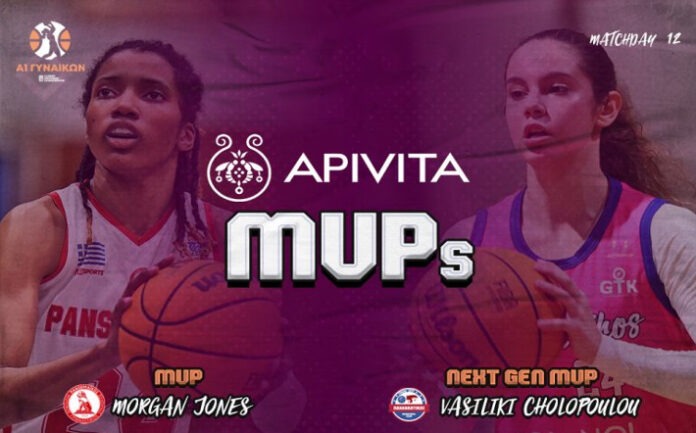 Η Τζακλίν Μόργκαν Τζόουνς του Πανσερραϊκού ήταν αυτή που αναδείχθηκε Apivita MVP της 12ης Αγωνιστικής, ενώ η Βασιλική Χωλοπούλου του Παναθλητικού κέρδισε τον τίτλο της Apivita MVP Next Gen.