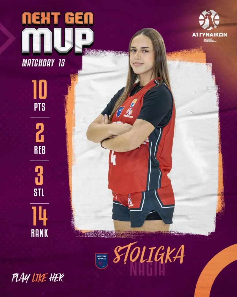 Με τη σειρά της η Νάγια Στολίγκα στην επικράτηση του Πρωτέα Βούλας με 91-78 με αντίπαλο την Ανόρθωση Βόλου είχε 10 πόντους 2 ριμπάουντ, 2 ασίστ, 3 κλεψίματα, μια τάπα και 14 στο σύστημα αξιολόγησης μετά από 23’56’’ συμμετοχής. Η γκαρντ του Πρωτέα Βούλας αναδεικνύεται για 5η φορά στη φετινή αγωνιστική σεζόν MVP Next Gen.