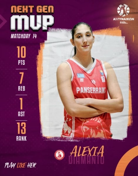 Από την άλλη η Διαμάντω Αλεξιά για 5η φορά τη φετινή σεζόν αναδεικνύεται MVP Next Gen. Η νεαρή σέντερ στην νίκη του Πανσερραϊκού με 79-54 επί του Αμύντα είχε 10 πόντους, 7 ριμπάουντ, μία ασίστ συγκεντρώνοντας 13 στο σύστημα αξιολόγησης μετά από 15’57’’ συμμετοχής.