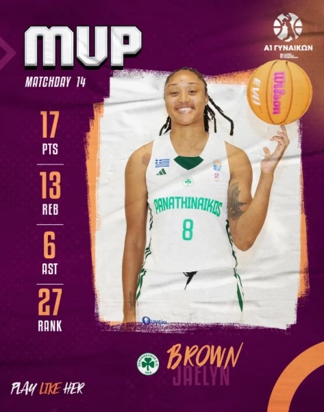 Η Τζάελιν Μπράουν του Παναθηναϊκού είναι η MVP της 14ης Αγωνιστικής με την Διαμάντω Αλεξιά να κερδίζει την διάκριση της MVP Next Gen.