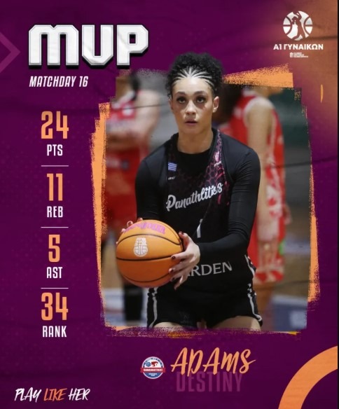 Η Ντέστινι Ανταμς στην επικράτηση του Παναθλητικού με 94-79 απέναντι στην Ανόρθωση Βόλου είχε 24 πόντους, 11 ριμπάουντ, 5 ασίστ 3 κλεψίματα, ένα κόψιμο συγκεντρώνοντας 34 στο σύστημα αξιολόγησης μετά από 25’13’’ συμμετοχής.