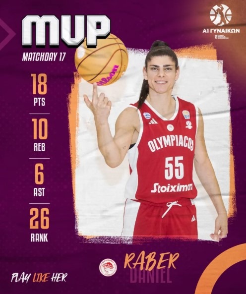 H Ντάνιελ Ράμπερ που είχε κερδίσει τον αντίστοιχο τίτλο και την πρώτη αγωνιστική στη νίκη του Ολυμπιακού με αντίπαλο τον ΠΑΟΚ με 78-73 είχε 18 πόντους με 10 ριμπάουντ, 6 ασίστ, ένα κλέψιμο και 26 στο σύστημα αξιολόγησης μετά από 33’52’’συμμετοχής.