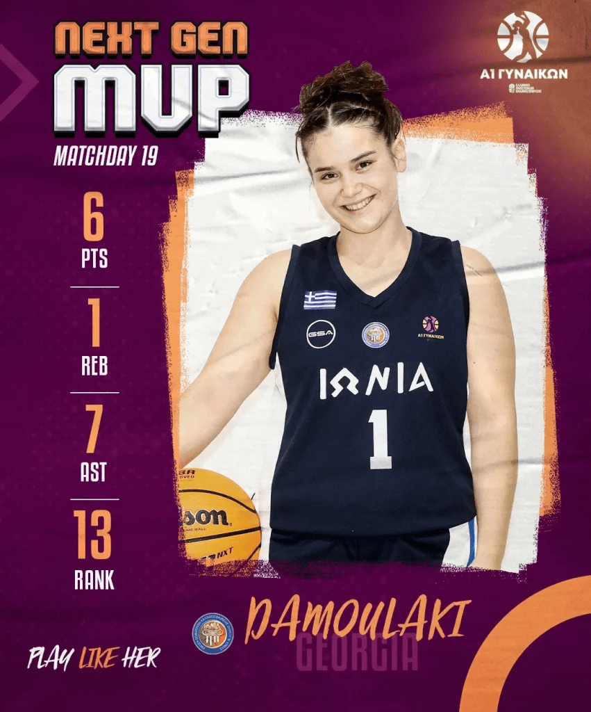 Η Γεωργία Δαμουλάκη από την άλλη κερδίζει για δεύτερη συνεχόμενη αγωνιστική τη διάκριση της MVP Next Gen. Η γκαρντ της Ιωνίας στην νίκη της ομάδας της με 91-87 απέναντι στην Ανόρθωση Βόλου είχε 6 πόντους, ένα ριμπάουντ, 7 ασίστ, ένα κλέψιμο συγκεντρώνοντας 13 στο σύστημα αξιολόγησης μετά από 25’22”συμμετοχής.